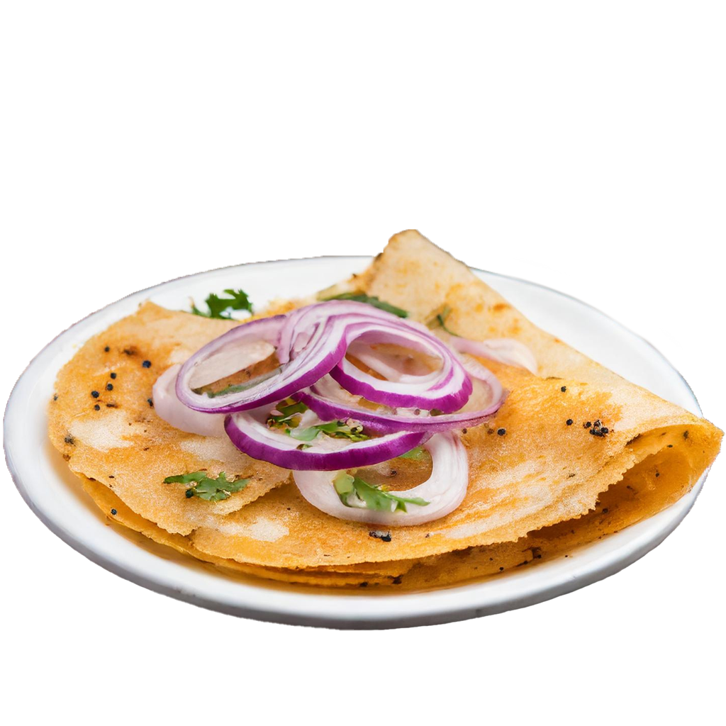 The classic South Indian dosa, a thin rice and lentil crepe, is elevated with a topping of finely chopped onions. This addition enhances the crispy texture of the dosa while imparting sweet and pungent flavors, making it a delightful and savory culinary experience.