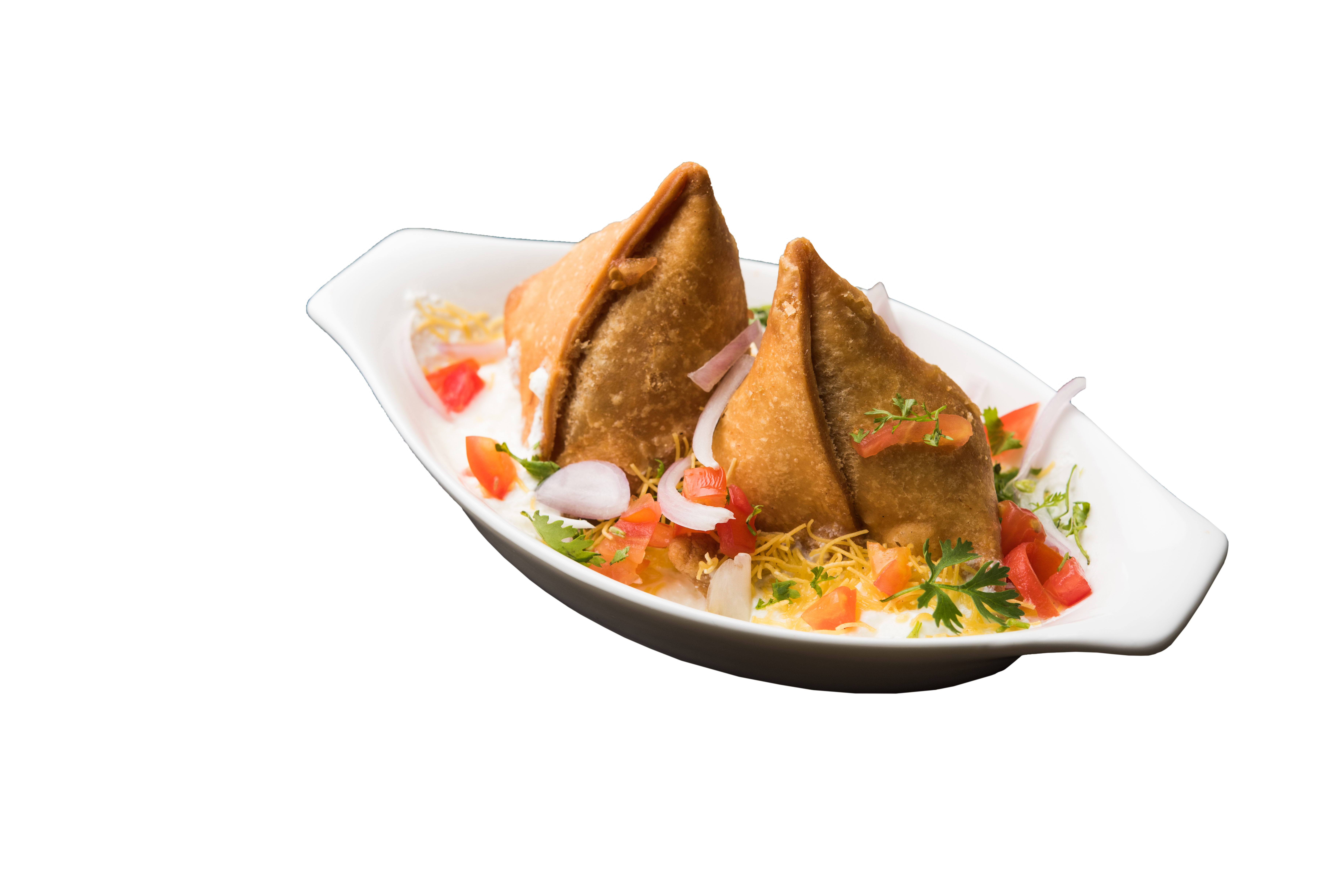 Samosa chaat, a beloved Indian street food, features a samosa topped with spiced chickpea curry, yogurt, chutneys, Sev (chickpea flour noodles), and fresh coriander.